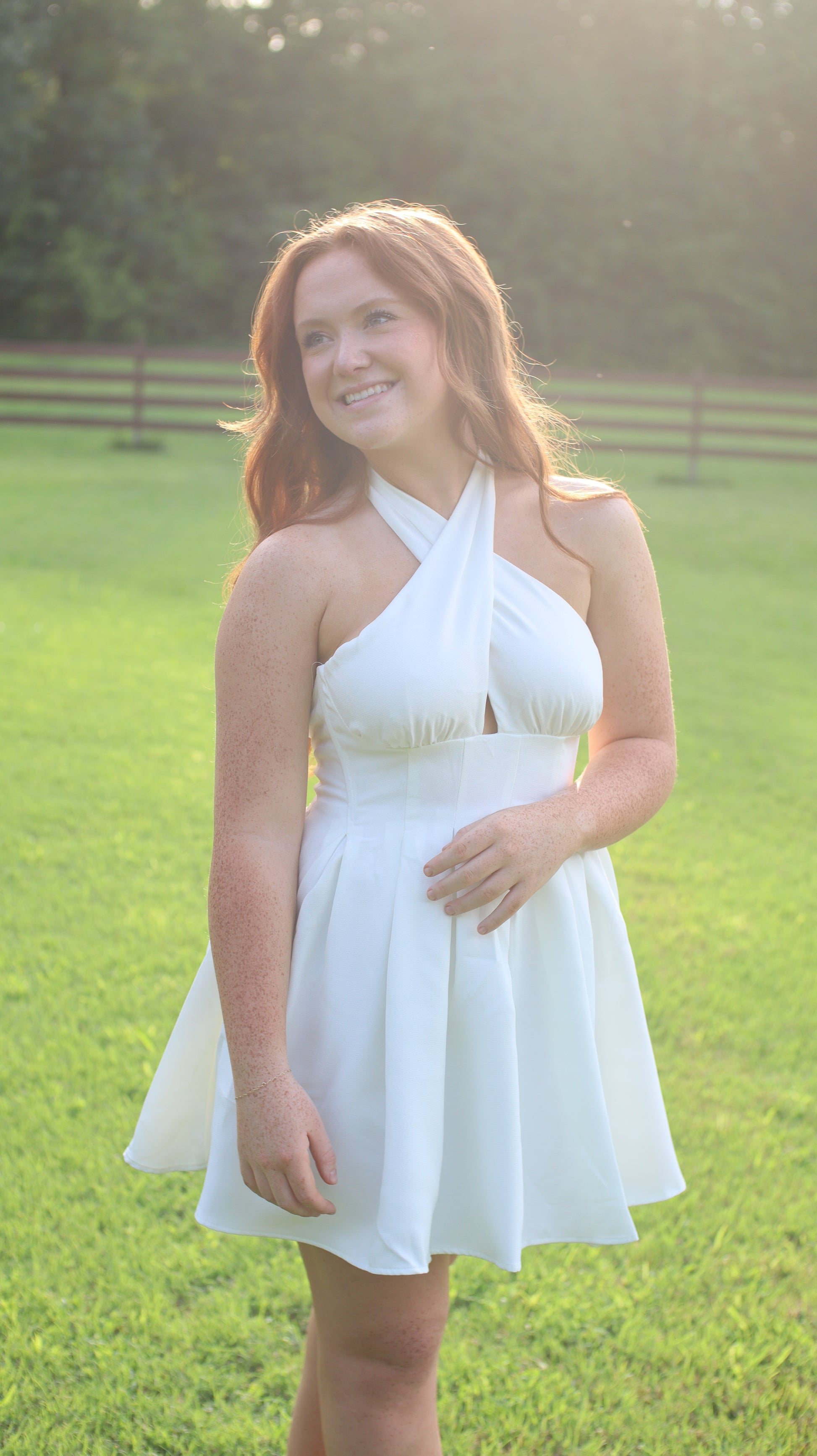 This beautiful white dress is perfect for your closet! A staple dress that you’re definitely going to love! Perfect for any upcoming brides, or for any event! It has a beautiful cross over neckline that ties in a bow at the neck. It has long ties that hang down your back in such a stunning way! Form fitting at the waist for a flattering fit.